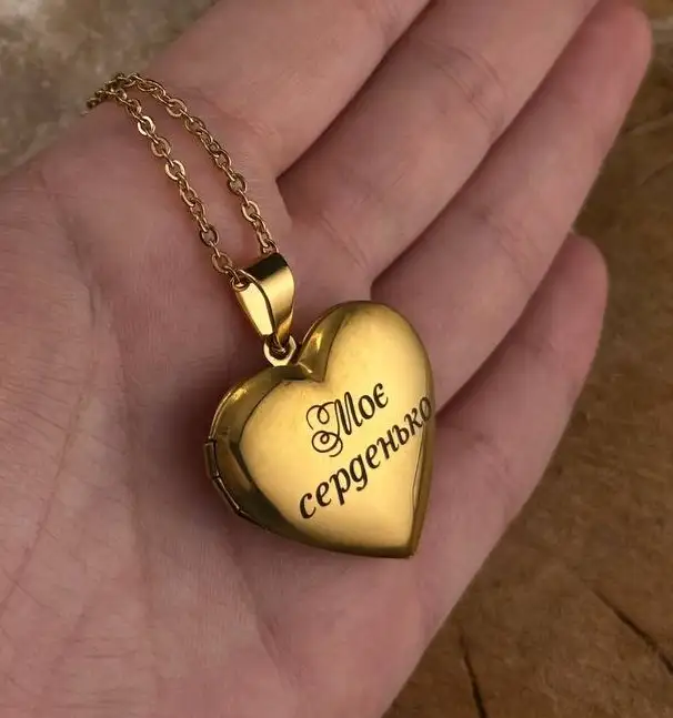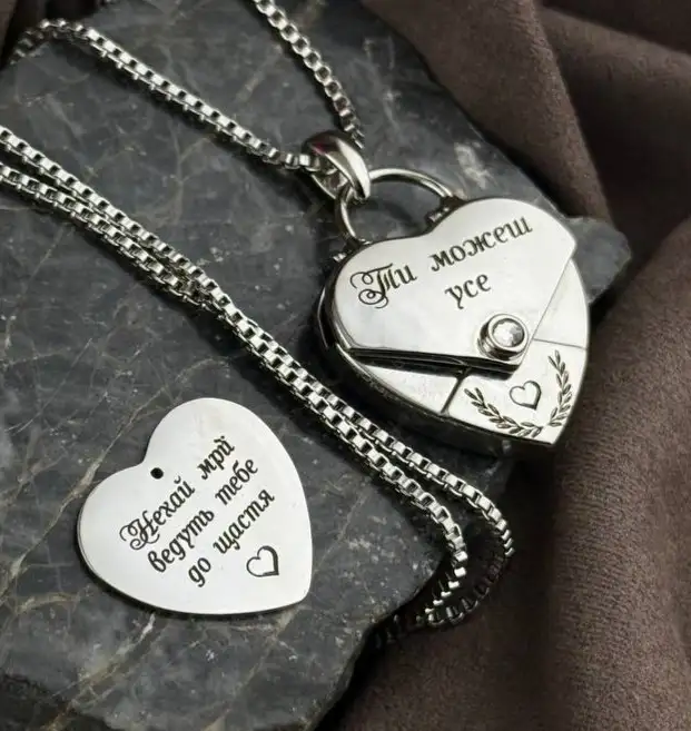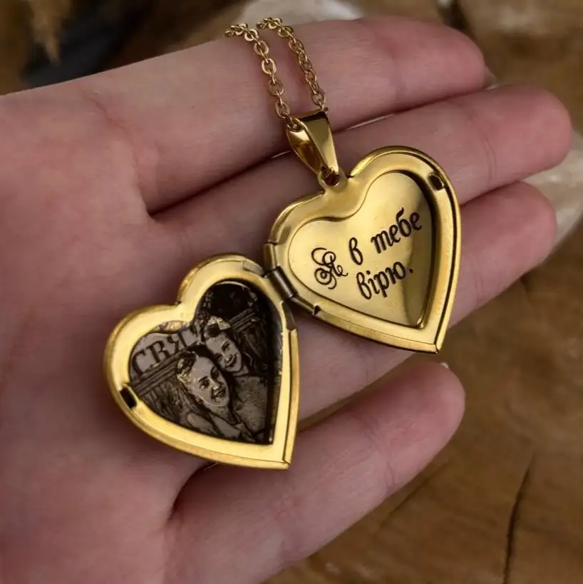 Можна будь-який текст - не лише як на прикладі! 2 гравіювання вже входять у вартість. Додаткове гравіювання: +100 грн/сторона. Кулон-фоторамка у формі серця, що відкривається — ідеальний спосіб зберегти спогади чи важливе послання яке буде завжди біля серця. Всередині можна розмістити фото або текст: ім’я, дату, коротке побажання чи символ. Цей кулон стане особливим подарунком для коханих, друзів або близьких і завжди нагадуватиме про важливі моменти життя