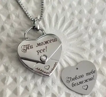 Можна будь-який текст - не лише як на прикладі! 2 гравіювання вже входять у вартість. Додаткове гравіювання: +100 грн/сторона. Персоналізований кулон-конверт у формі серця: ім’я, дата або символ, те що завжди буде поруч.