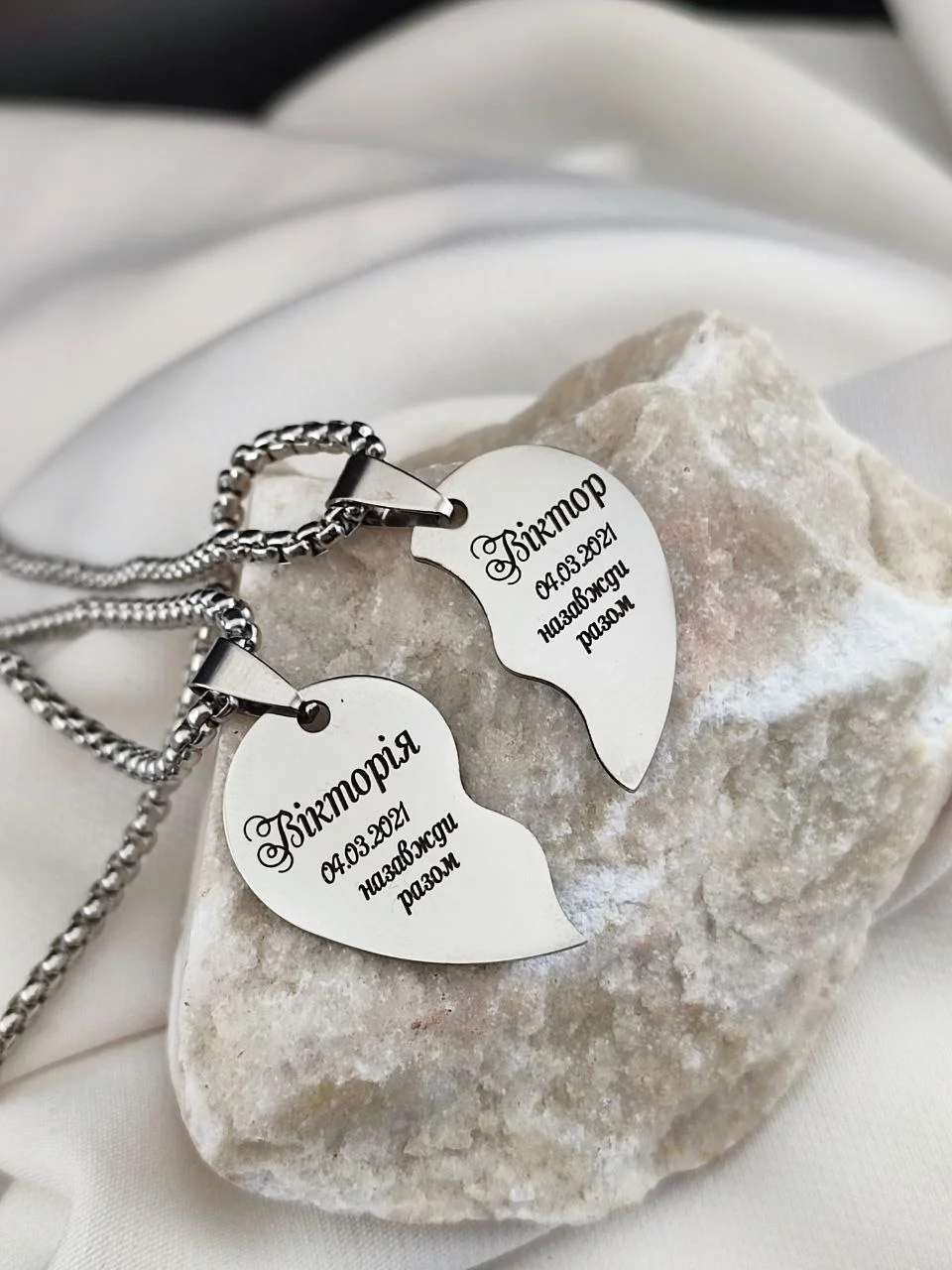 Можна будь-який текст - не лише як на прикладі! 2 гравіювання вже входять у вартість. Додаткове гравіювання: +100 грн/сторона. Кулони-половинки серця — ідеальний спосіб символізувати зв’язок з близькою людиною. Доповни кожну половинку: ім’ям, датою або символом. Ви залишаєте собі одну половинку, а другу даруєте коханому, чи просто близькій людині — і таким чином зберігаєте ваш особливий зв’язок завжди поруч із серцем